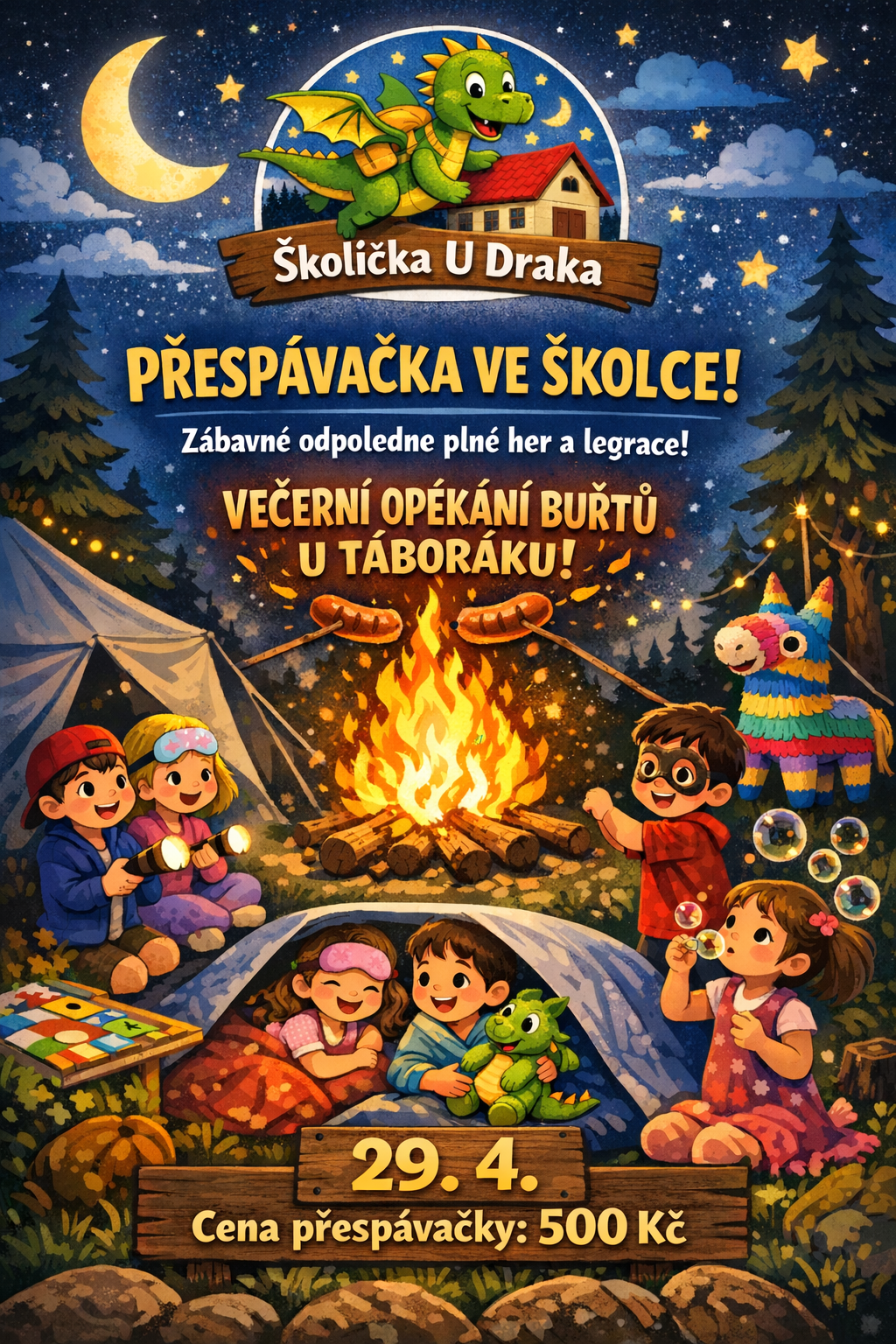 Read MoreVážení rodiče, ve středu 29. 4. proběhne na školce další nezapomenutelná „přespávačka“, na kterou se již nyní můžete přihlásit. Děti budou mít celý den pestrý program zakončený večerním táborákem s opékáním buřtů. Vybíráme 500 Kč/osoba. V případě, že byste dítko chtěli nechat pouze na odpolední program a „opékačku“ vybíráme 200 Kč. Děkujeme a moc se…