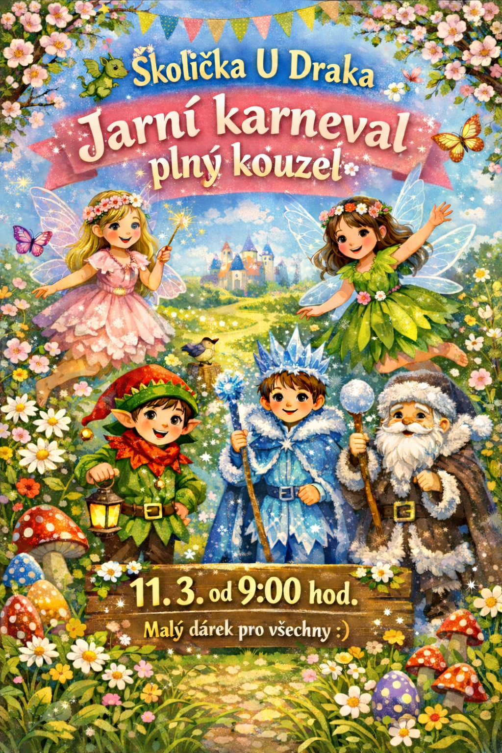 Read MoreMilí rodiče, ve středu 11. 3. si s dětmi na školce uděláme „Jarní karneval plný kouzel“ s úkoly a občerstvením. Tento den děti přiveďe nejpozději do 9:00 hod. Holčičky ať mají „masku víly“ – šaty, křídla, čelenku atp…. Kluci ať dorazí jako skřítci či Pánové Zimy (v bílém oblečení, vousy, klobouk atp…). Na děti čeká…